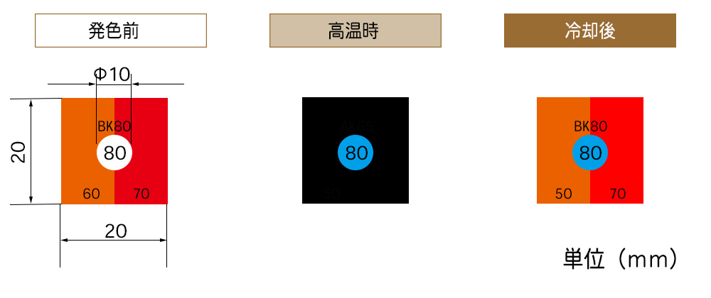 | 発色温度(℃) | 発色色調 | 低温部(左側) | 低温部(右側) | |